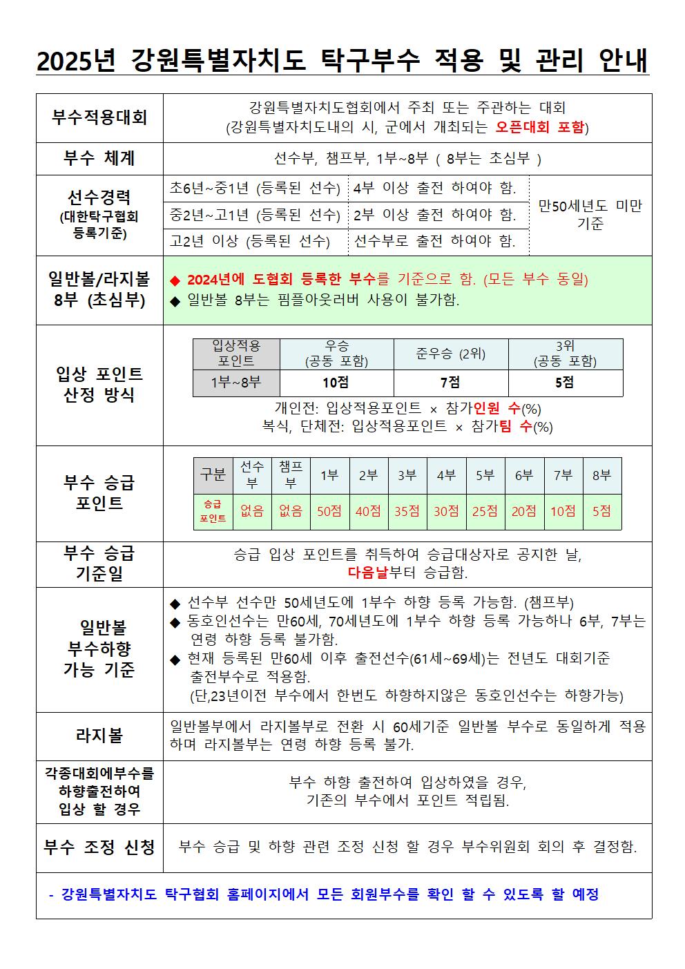 강원특별자치도 탁구협회 생활체육 탁구동호인 부수 규정 (개정 2025.08.01.)