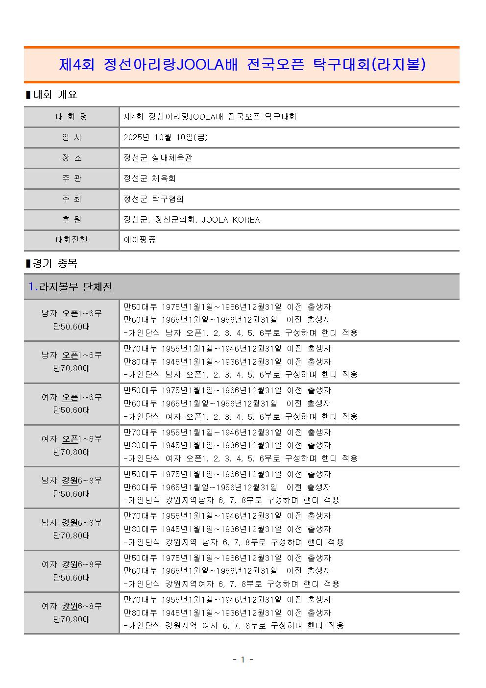 제4회 (라지볼)정선아리랑JOOLA배 전국오픈 탁구대회(2025.10.10.)