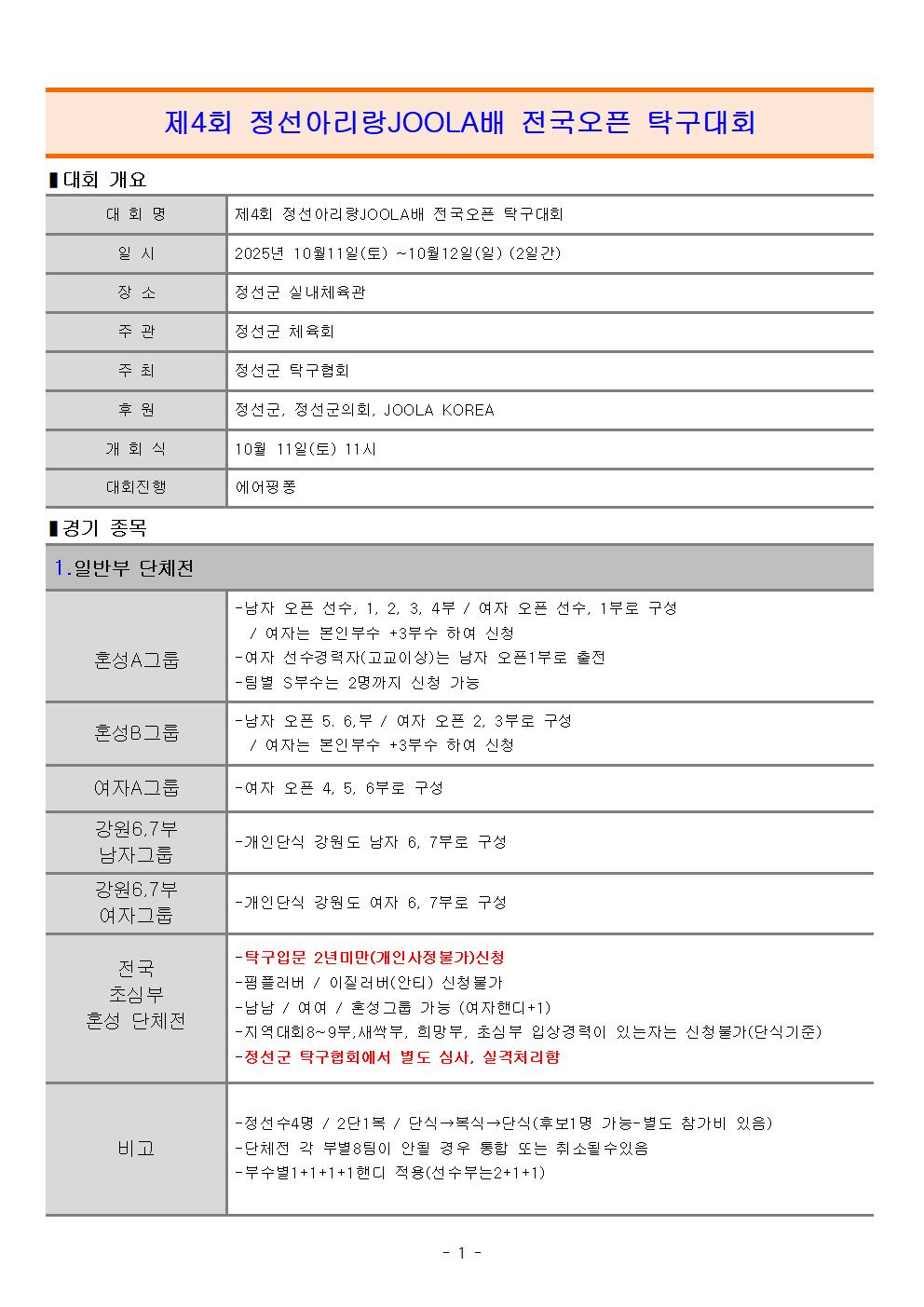 제4회 (일반볼)정선아리랑JOOLA배 전국오픈 탁구대회(2025.1011.~10.12)