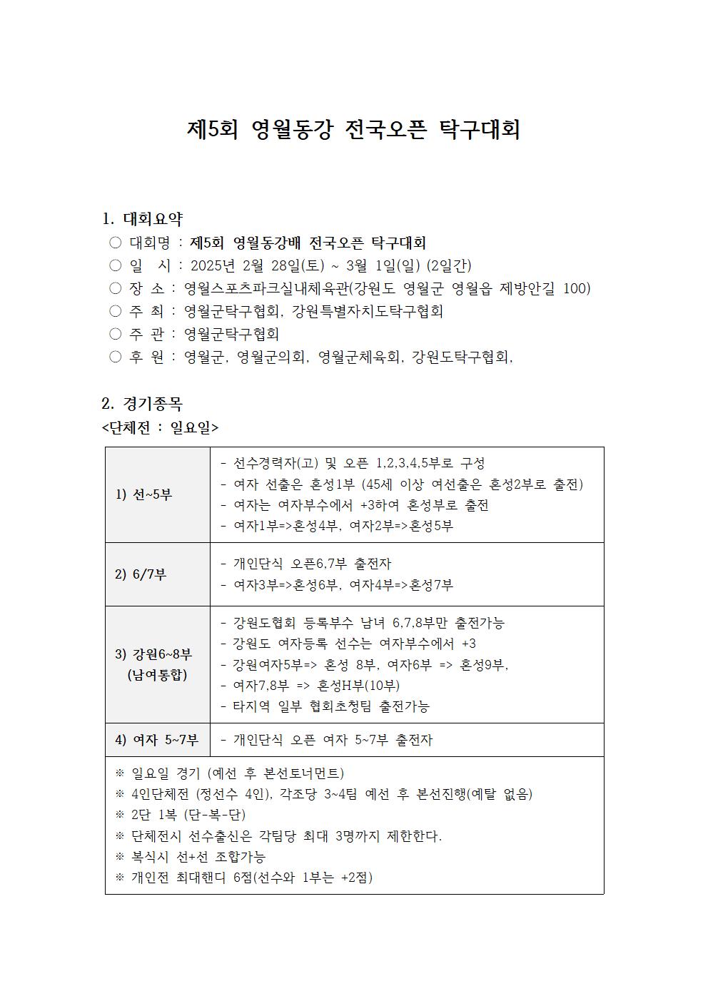 제5회 영월동강배 전국오픈 탁구대회(02.28~03.01)